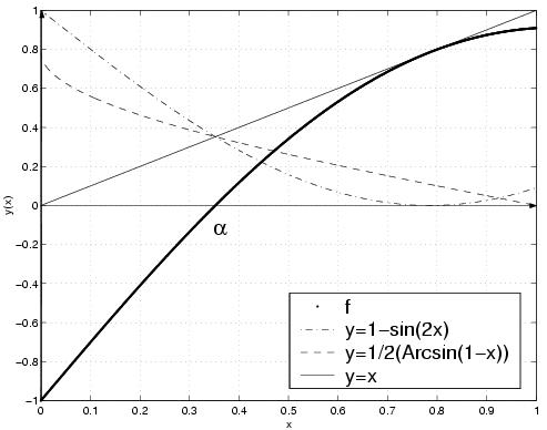 legend('f', 'y=1-sin(2x)', 'y=1/2*(Arcsin(1-x))', 'y=x');